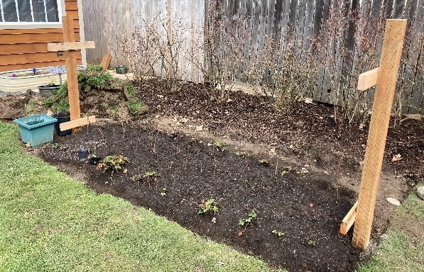 In the photo above we built a trellis for our raspberries that are planted in the center of the trellis and strawberries along the outside of the bed. Behind the raspberries, you can see blueberries that are approximately 10-15 years old.